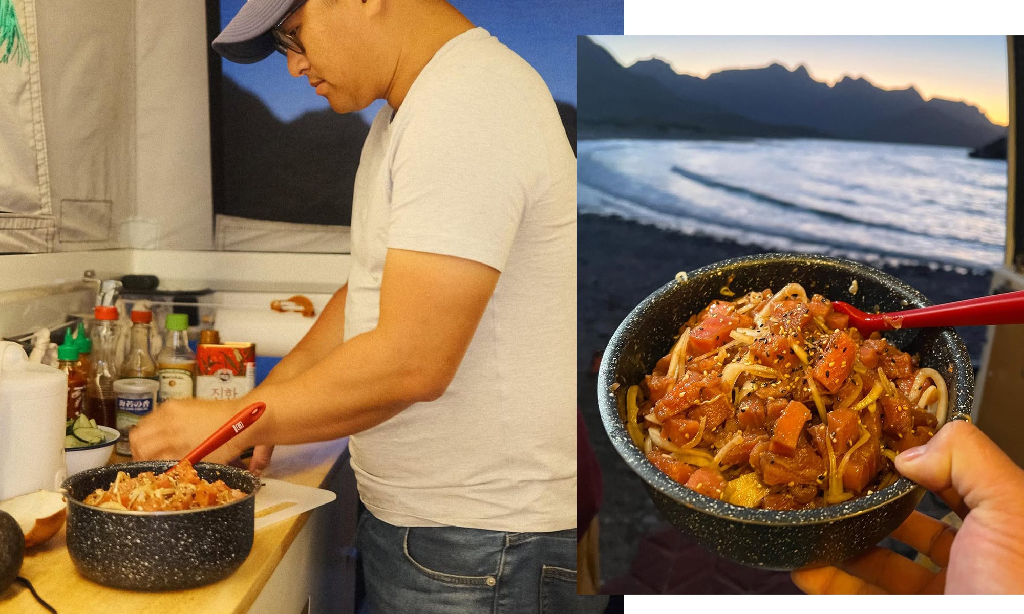 When we think of outdoor cooking, what comes to mind? Hot dogs sizzling over a fire, a cast-iron pan of bacon and eggs, or maybe canned chili warmed over a gas stove. These images dominate our perception of camp cuisine. But Linhbergh and Karissa of Gon Dirtin (@gondirtin) are flipping that script, carving out a new narrative for what it means to eat in the wild.